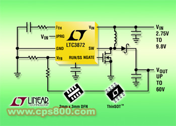 LTC3872 采用耐熱增強型扁平(0.75mm)8 引線 2mm x 3mm DFN 封裝以及 ThinSOTTM 封裝。該器件規(guī)定在 -40oC 至 125oC 的結(jié)溫下工作。以 1,000 片為單位批量購買,每片起價為 1.80 美元。