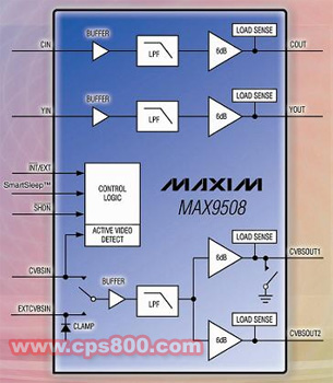 MAX9508的工作電源是2.7到3.6V,為便攜式DVD播放器、機頂盒(STB)和便攜式媒體播放器(PMP)提供雙向視頻支持。MAX9508包含三個重建濾波器(6.75MHz通帶)、四個視頻放大器和在兩個CVBS輸出上的一個二選一下拉開關。該開關可以被用做2選1開關以選擇兩個輸入源;同一個開關,還可以控制位于CVBS視頻連接的雙向視頻信號,而不必獨立的開關或繼電器。后一種功能對于便攜式DVD播放器特別有用,它常常采用同一個連接器來驅動復合視頻輸出,并接收外部視頻信號,提供給便攜式DVD播放器的LCD面板顯示。兩個CVBS輸出可以被直流耦合并驅動最多兩個對地視頻負載,或交流耦合到一個視頻負載。