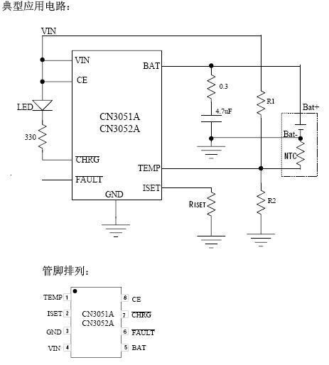 CN3051/CN3052是可以對單節鋰離子或者鋰-聚合物可充電電池進行恒流/恒壓充電的充電器電路。