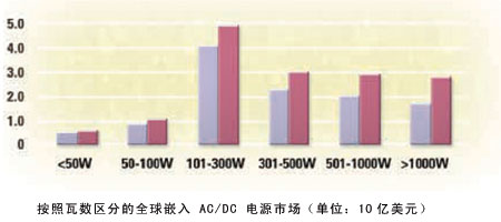 根據(jù) Darnell 集團(tuán)最新發(fā)布的AC/DC電源報(bào)告,全球嵌入 AC/DC 電源市場(chǎng)將從 2006 年的 118 億美元增長(zhǎng)到 2011 年的 148 億美元。年度增長(zhǎng)率為 5.8%。但是,500 W 以上嵌入 AC/DC 電源的增長(zhǎng)速度是整體市場(chǎng)的兩倍,雖然它的價(jià)格下降速度最快。這種轉(zhuǎn)向更高瓦數(shù)的趨勢(shì)由快速增長(zhǎng)的應(yīng)用所帶動(dòng),包括刀片服務(wù)器、以太網(wǎng)供電(PoE)以及數(shù)據(jù)存儲(chǔ)。
