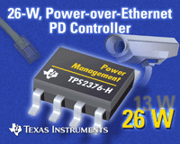 日前,德州儀器 (TI) 宣布推出一款 26 瓦以太網供電 (PoE) 控制器,該器件通過標準以太網線纜為眾多以太網供電的設備提供多達兩倍的電量,而無需使用 AC 線,這些設備包括IP 監控攝像頭、WiMAX 接入點設備以及會議 IP 電話等。TI 已在 ASIS 國際安全大會(9 月 25 - 28 日,圣迭戈)上通過高功率 PoE 參考設計演示這款全新電源管理 IC。