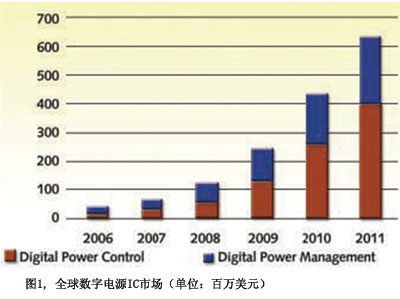 Darnell 集團《新興的市場在于數字電源電子器件,第二版》中預測 :全球數字 電源控制和管理IC市場將從2006年的僅4200萬美元增長到 2011年的 6.33 億美元,在這五年內的年均復合增長率為 72%(見圖1)。市場的主要增長動力將來自于數字環路控制IC,它在 2006 年估計占數字電源IC總銷售額的32%,到2011年將增至69%。