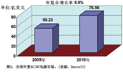 總體來說,全球外部 AC/DC 電源市場值預計將從 2005 年的 50.23 億美元增長到 2010 年的 76.56 億美元,年復合增長率為 8.8%(見圖2)。