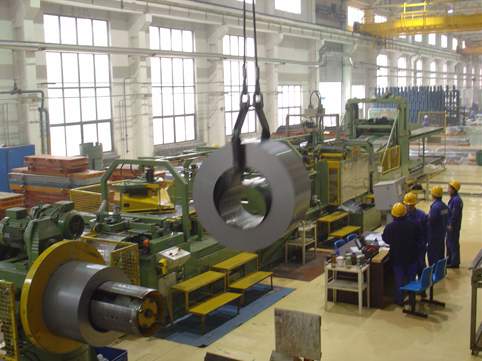 天威保變員工正通過數控喬格線——生產變壓器核心部件鐵芯的生產線,將大卷的硅鋼片加工成首批800KV變壓器所需的鐵芯板塊