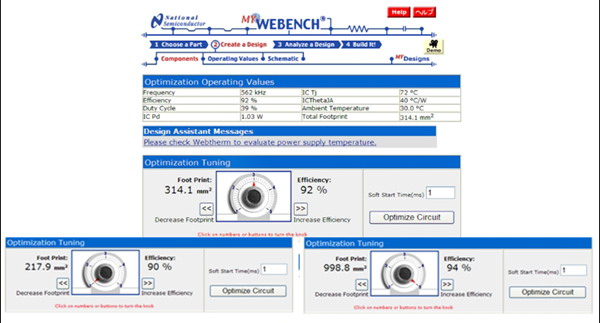 美國國家半導體亞太區電源管理產品市場總監黃漢基介紹說,該公司的WEBENCH在線工具可為工程師推薦合適的器件,并進行設計優化,具體到電源設計上就是:根據用戶設定的輸入電壓、輸出電壓和輸出電流以及工作時環境溫度等信息,利用在線電氣仿真和熱仿真,設計并優化電源,并可快速獲得定制的原型套件。
