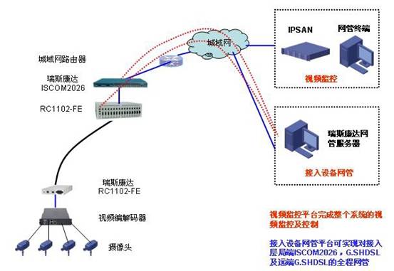 方案說明:此方案采用瑞斯康達(dá)公司ISCOM2026以太網(wǎng)交換機(jī)以及一對(duì)G.SHDSL設(shè)備組成。交換機(jī)百兆光/電口上行至城域網(wǎng)交換機(jī)/路由器,下行連接至RC1102-FE,通過城域內(nèi)布放的雙絞線(電話線)連接至遠(yuǎn)端RC1102-FE。實(shí)現(xiàn)視頻數(shù)據(jù)的接入。