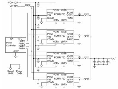 圖4 基于最新發布的驅動器+FET MCM的4相降壓轉換器電路