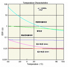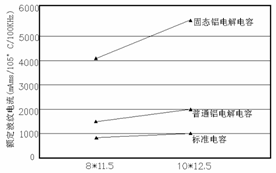 傳統的液態電解質的離子是在液體中移動,其導電分子電導指數不如固態有機聚合物的導電性能高,由于固態電解電容器的ESR比液態鋁電解電容的小得多,使其在耐紋波電流方面也比液態鋁電解電容有更優異的表現。因此,固態電容的額定紋波是普通電容的額定紋波電流的4~5倍。且固態電容比液態電容不容易受環境溫度的影響,因此更加穩定且不容易出現爆漿現象。