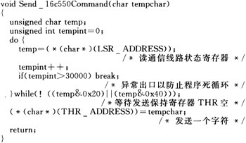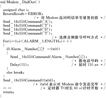 上述撥號程序模塊中,函數Send 16c550Command()的功能是向Modem發送一個AT命令字符,函數體內容如下: