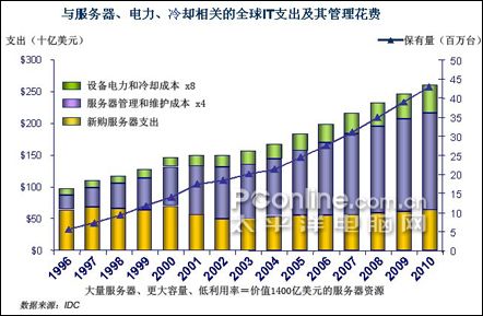 很多企業(yè)目前的數(shù)據(jù)中心隨著業(yè)務(wù)的擴(kuò)展變得越來越龐大,企業(yè)為所擁有的服務(wù)器及數(shù)據(jù)中心每年所支付的電費(fèi)和維護(hù)成本上升得很快,并有進(jìn)一步加快的趨勢(shì)。這是IT技術(shù)不斷發(fā)展給人們帶來的一個(gè)副作用。依照摩爾定律,芯片中的晶體管和電阻器的數(shù)量每?jī)赡陼?huì)翻番,顯然芯片所耗用的能源也會(huì)增加,使得企業(yè)在享用高性能IT產(chǎn)品的同時(shí),也要無奈地支付高昂的電費(fèi)。目前數(shù)據(jù)中心不但要為新購進(jìn)的服務(wù)器、存儲(chǔ)等設(shè)備支付費(fèi)用,還要為設(shè)備的運(yùn)轉(zhuǎn)、冷卻、占地面積支付費(fèi)用,這逐漸成為了擺在企業(yè)CIO與CFO之間的一大難題。