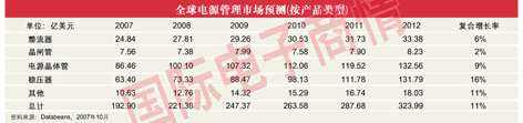 Databeans預測在未來五年,總體電源管理市場將達到324億美元,占到整個半導體市場的7%。穩壓器市場預計從2006年的60億美元增長到2012年的132億美元,年復合增長率為16%,這已經明顯高于大多數半導體產品的銷售額預計。在未來五年,電源集成電路的銷售額預計以11%的年平均增長率發展,而分立電源產品銷售額增長率預計為8%。