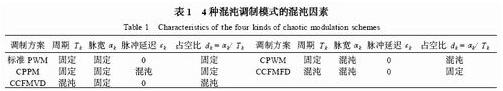 根據文獻,混沌開關調制信號有表1以標準PWM為參照的4種調制模式。即標準PWM脈的參數由混沌序列調制的“混沌脈沖寬度調制”(CPWM)、“混沌脈沖位置調制”(CPPM)、“定占空比混沌載頻調制”(CCFMFD)以及“變占空比混沌載頻調制”(CCFMVD)。各種調制模式的具體調制過程為:對CPWM模式,開關導通時間由Ton=T/2+(x(n)-x)T/k決定,k=2;對CPPM模式,開關延遲時間位于[0,0.5T];對CCFMVD模式,與CPWM一樣,使開關導通時間Ton=T/2+(x(n)-x)T/k隨混沌序列變化,開關斷開時間為0.5T,由于導通時間變化,斷開時間固定,周期變化,占空比不定;對CCFMFD模式,每一個開關周期T(n)=T+(x(n)-x)T/k都是變化的,開關的占空比固定。兩種混沌載頻調制模式下k=2,占空比或平均占空比均為0.5。