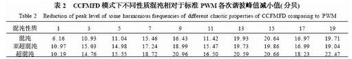 從表中給出的以標準周期PWM前19次諧波為參照的數據可以看出,分別在混沌、亞超混沌及超混沌信號調制下,各次諧波對應處的頻譜數值都得到了明顯的降低。在混沌信號調制下,諧波對應處的頻譜數值平均降低14.87分貝(dB);在亞超混沌信號調制下,諧波對應處的頻譜數值平均降低16.84分貝(dB);在超混沌信號調制下,諧波對應處的頻譜數值平均降低17.86分貝(dB)。若以歐盟(89/336/EEC指令)電磁兼容性導則中限制設備輸入電流諧波分量最大值幅度這一原則,來討論不同性質混沌信號降低電磁干擾水平的效果,結論非常明顯,即以超混沌信號作為開關調制信號源,比混沌能更好地降低電磁干擾水平。