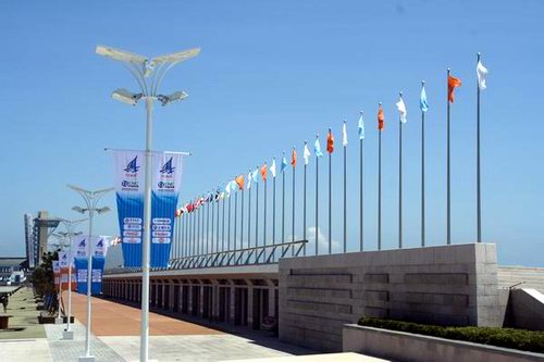 太陽(yáng)能景觀燈和風(fēng)能路燈是奧帆中心的又一大景觀。這里共安裝了168盞太陽(yáng)能燈和41盞風(fēng)能路燈,不僅綠色環(huán)保,到了夜間更是青島海岸線上一道耀眼的風(fēng)景。在風(fēng)能資源豐富、獨(dú)特的主防波堤建設(shè)安裝了41盞風(fēng)能燈,每盞燈14000元,總投資57400元,每盞可供55瓦鈉燈每天照明8小時(shí),每年節(jié)電6570度。以上項(xiàng)目建設(shè)完成后,在取得顯著的節(jié)能效益的同時(shí),還具有良好的環(huán)保效益。有趣的是,按照設(shè)計(jì),風(fēng)速達(dá)到每秒3米時(shí),風(fēng)能路燈頂部的風(fēng)車就會(huì)轉(zhuǎn)起來(lái),而開展帆船比賽的風(fēng)速下限也是每秒3米,當(dāng)風(fēng)車轉(zhuǎn)起來(lái)的時(shí)候,觀眾就知道可以進(jìn)行比賽了。