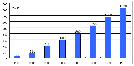 隨著國內相關企業生產規模的擴大及新的芯片公司的陸續進入,在國內需求市場的推動下,國內 InGaN 芯片產能已經由 2003 年的 65KK/ 月倍增至 2005 年的 400KK/ 月,國內自產供應率逐年提升。 2006 年國內 InGaN 芯片產能較 2005 年增長 50 %,已達 600KK/ 月。預計未來幾年國內 InGaN 芯片仍將保持 30 %左右的年復合增長率(參見圖 7 ),至 2010 年國內將超過日本成為全球第二大 GaN 芯片生產基地,產能高達 1650KK/ 月。
