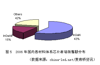 2006 年國內 LED 芯片市場分布如圖 5 所示。 其中 InGaN 芯片市值約占據 43 %, 四元 InGaAlP 芯片市值約占據整個國內 LED 芯片的 15 %;其他種類 LED 芯片的市值約占據 42 %。從國內芯片產值上計算, 2006 年國內 InGaN 芯片產值 4.5 億元,同期國內 InGaN 芯片需求總產值 25 億元。國內非 InGaN 芯片(普亮和四元)總產值 6 億元,同期國內非 InGaN 芯片需求總產值 17 億元。合計國內芯片市場總需求 42 億元。