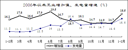 1-2月,全國發電量4480億千瓦時,同比增長16.6%,增速同比加快5.4個百分點;其中,火電、水電分別增長18.2%和10.1%。電力供求緊張狀況比去年同期繼續緩和,但京津唐、湖北、四川、湖南、西藏、江蘇、云南、廣東、海南等9個電網仍存在拉閘限電現象。前兩個月,電力行業實現利潤215億元,增長59.2%。