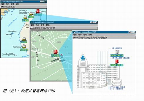 臺達UPS UPSentry Manager遠程集中監控管理軟件:可以對所有的UPS系統經由廣域網或專線網絡進行集中監管,以監視各UPS的運行情況并作記錄,當各UPS有事件告警時,manager軟件會自動亮燈告警,并跳出圖屏,顯示該告警UPS的問題,平時也可以點閱各聯網UPS,以階層式管理方式完成集中管理。如圖四。