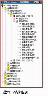 由于階層式架構非常適于以樹狀圖來表示,并且集中監控程序提供樹狀圖有助于管理者一眼就能找出所有異常的UPS,當面臨多部UPS同時告警時就不需要為了查詢各UPS最新狀態而經常切換數個監控畫面如圖六。