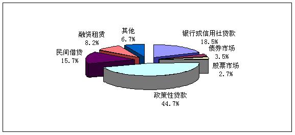 在企業選擇融資方式的調查中顯示,選擇政策性貸款的企業為44.7%,選擇銀行或者信用社貸款的企業所占比例為18.5%,選擇民間借貸的企業比例為15.7%,其他的方式所占比例較小。