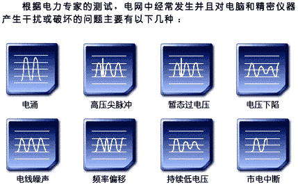 有一個(gè)常見(jiàn)的錯(cuò)誤概念,認(rèn)為我們使用的市電,除了偶爾發(fā)生的斷電事故,是連續(xù)而且恒定的,其實(shí)不然。市電系統(tǒng)作為公共電網(wǎng),上面連接了成千上萬(wàn)各種各樣的負(fù)載,其中一些較大的感性、容性、開(kāi)關(guān)電源等負(fù)載不僅從電網(wǎng)中獲得電能,還會(huì)反過(guò)來(lái)對(duì)電網(wǎng)本身造成影響,惡化電網(wǎng)或局部電網(wǎng)的供電品質(zhì),造成市電電壓波形畸變或頻率漂移。另外意外的自然和人為事故,如地震、雷擊、輸變電系統(tǒng)斷路或短路,都會(huì)危害電力的正常供應(yīng),從而影響負(fù)載的正常工作。根據(jù)電力專家的測(cè)試,電網(wǎng)中經(jīng)常發(fā)生并且對(duì)電腦和精密儀器產(chǎn)生干擾或破壞的問(wèn)題主要有以下幾種: