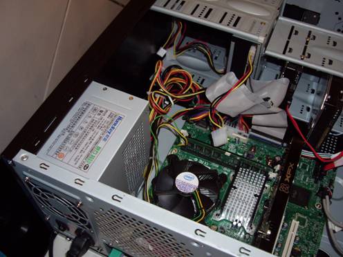 奔騰® 雙核E2140、酷睿™ 2 雙核E4300的設計功耗也只有65W,這相當于基于Netburst架構的奔騰D的一半左右。而剛剛推出的賽揚® 400系列產品TDP(散熱設計功耗)僅35W,現場ricky將散熱器風扇出去主機依然可以正常運行,當年486CPU都做不到這一點,不得不佩服CPU進步之快呀。下圖就是當時主機正在運行,可CPU散熱器是沒有轉的。
