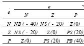 定義輸入量e和e的模糊集為:{負(fù)(N)、零(Z)、正(P)},控制量u的模糊集為{負(fù)大(NB)、負(fù)小(NS)、零(Z)、正小(PS)、正大(PB)},對應(yīng)隸屬函數(shù)均為三角型(圖3)。基于式(2)PID專家知識的模糊變量賦值按以下過程建立:因PID調(diào)節(jié)器的比例與微分系數(shù)之比kp/kd=200,若e的變化范圍是[-1,1],則可以確定e的變化范圍是[-200,200]。如果e是負(fù)(-1),且e也是負(fù)(-200),那么基于PID的模糊推理結(jié)果即控制量u約是-40,也就是說u值論域中的負(fù)大(NB)對應(yīng)于-40。依此類推,可獲得其余推理結(jié)果,模糊控制表如表1所示。