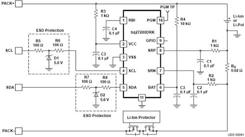 在電池管理中,電池"容量計"正變得日益流行。在傳統上,通常用以下方法來測量電池容量,即:先測量鋰離子電池的電壓,然后再用存儲在存儲器中的容量查找表來得出有關可用電池功率的結果。但由于3G手機復雜的功耗特性及鋰離子電池性能隨時間、溫度及負載條件的變化,上述方法并不實用。為精確測量剩余電池容量以使處理器能更好地管理手機功耗,人們采用了具有"阻抗跟蹤"能力、并能測量進出電池實際電量的高性能庫侖計。這使處理器能有效地部署電池節省模式、精確確定電池耗盡時間以及當需要充電時向終端用戶告警等。圖2即顯示一種集成在電池盒中、并通過 I2C通信接口向主處理器發送參數的庫倫計。