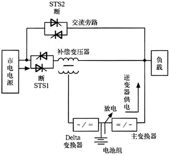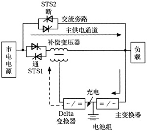 (3)當輸出短路、輸出過載、溫升過高、主變換器或Delta變換器發出故障時,STS1關斷,STS2導通,市電電源經過交流旁路通道給負載供電。