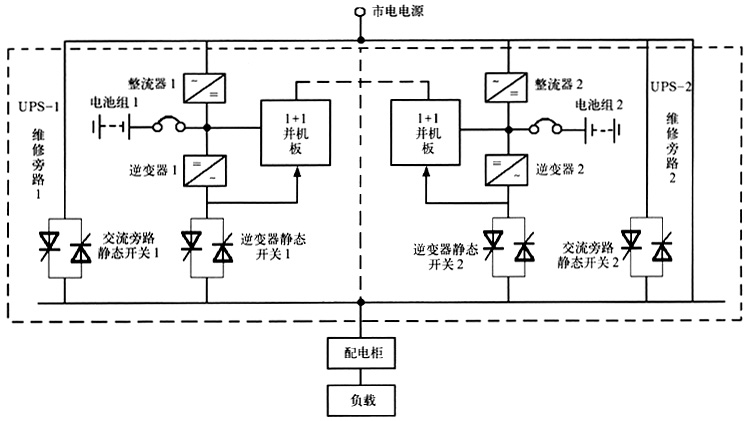 圖4 兩臺UPS組成的熱備份冗余供電系統