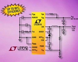 LTC3610 采用 RDS(ON) 僅為 12mΩ 和 6.5mΩ 的內部開關,以實現高達 95% 的效率。LTC3610 可以配置為斷續或強制連續工作。強制連續工作降低噪聲和 RF 干擾,而斷續模式通過降低輕負載時的開關損耗實現高效率,同時僅需要 900uA 的靜態電流。無負載靜態電流僅為 15uA。其它特點包括電源良好(Power Good)電壓監視器、可調限流值、輸出過壓保護和可編程軟啟動。