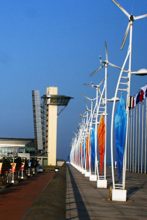 據介紹,奧帆中心共安裝了41盞風能路燈,每盞可供55瓦鈉燈每天照明8小時,每年節電約6570度。這里還安裝了太陽能景觀燈168盞,每盞可供35瓦鈉燈每天照明8小時,每年節電約17000度。