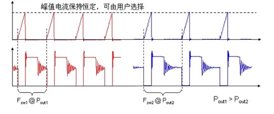 除了這兩種架構,固定導通時間(FON)架構近年來越來越多地受到業界矚目。在這種架構下,峰值電流保持恒定,且可由用戶選擇;而開關頻率則會變化(改變關閉時間),以提供所需的輸出功率,它在頻率最高時提供的輸出功率也就最大。FON的工作原理如圖1所示。