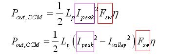 與固定開關頻率架構一樣,固定導通時間架構也支持CCM和DCM這兩種工作模式。它在這兩種模式下的輸出功率計算公式如下圖所示。如上所述,峰值電流Ipeak通過控制器來保持恒定,開關頻率Fsw則由反饋回路進行控制,而要適應不同的輸出功率需求,開關頻率會發生變化來滿足圖2中的等式。在缺少回路控制(短路,啟動)時,開關頻率會被鉗位。