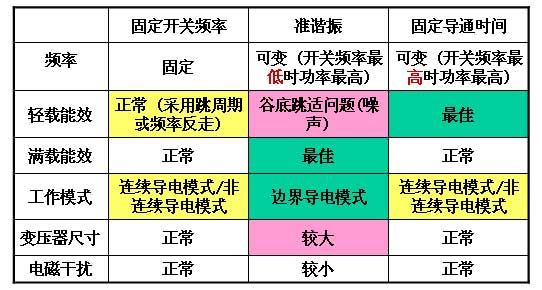 在滿載條件下,開關頻率則會增加,直至其碰到時序電容Ct鉗位。而在輕載條件下,峰值電流減小,開關頻率下降,這就限制了可聽噪聲的問題。在輕載時,由于開關頻率的下降,與開關頻率相關的損耗,如功率MOSFET輸出電容Coss和門電荷損耗以及泄漏感抗損耗也會減少。這樣一來,開關電源在輕載條件下的能效也會提高。因此,我們也可以得出結論,固定導通時間(FON)控制器可大幅提高開關電源在輕載條件下的能效。圖3對不同PWM控制器架構進行了比較。