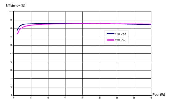 圖6:基于NCP1351C的安森美半導體40 W GreenPointTM打印機電源參考設計在不同輸出功率條件下的能效。