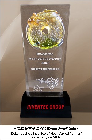 臺達電子高階電源事業(yè)部因持續(xù)不斷提供英業(yè)達高質量的服務器電源解決方案與服務,獲得英業(yè)達頒發(fā)2007年最佳合作伙伴獎,以表彰臺達電子杰出的研發(fā)、生產(chǎn)效率與快速響應客戶需求的能力,這也是臺達團隊連續(xù)第三年獲頒此殊榮。