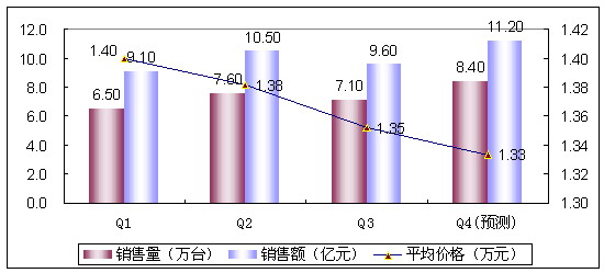 2007年通信電源市場主要受益于四大要點的發展:TD-SCDMA試商用、2G擴容、服務外包、海外規模突破。由于通訊設備行業有一定季節性,一般1、3季度為淡季,而2、4季度為旺季,因此通信電源也具有季度性波動的特點。整體來看,預計2007年通信電源銷售量達到29.6萬臺,銷售額達到40.4億元。同比2006年,銷售額增長8.9%,銷量增長了10.3%。