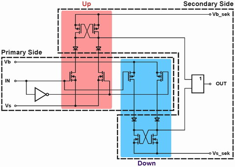 BOT電平轉換器的基本原理如圖 2a所示。在兩個獨立的傳輸通道上驅動一個TOP和一個BOT電平轉換器。電平轉換器是在每個路徑上帶額外二極管的常規(guī)靜態(tài)CMOS電平轉換器。根據(jù)原邊和副邊間電平轉換的極性,TOP或BOT電平轉換器被用于信號轉換,而其他級別的電平轉換器被反向二極管所阻擋。在副邊,所需要只是簡單的OR電路。