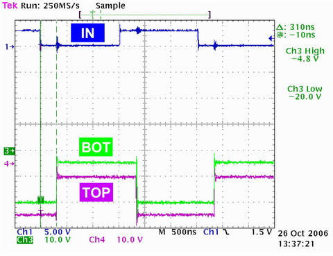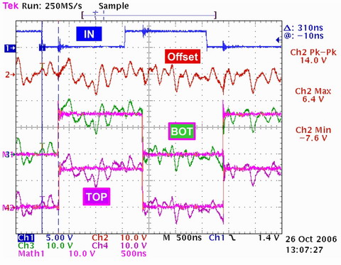 在TOP和BOT開關控制中采用雙極性電平轉換器這一先進概念,使得驅動器可以免受參考電壓變化的影響,只受電平轉換器開關阻斷能力的限制。在靜態(tài)電壓變化情況下,電平轉換器的功能由圖3a和圖3b中的信號特征來體現(xiàn),電壓變化分別為+20V和-20V。動態(tài)電壓變化也很容易補償,如圖4a所示。此處,二次側驅動信號的特征幾乎是理想的,盡管在發(fā)射極電壓和驅動器參考電壓之間引入了噪聲信號。