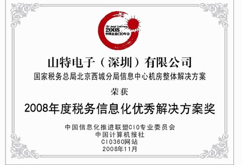 近日,2008年中國企業CIO年會在京舉行,本次年會以“信息化與工業化融合下的IT重塑”為主題。中國計算機報作為權威的IT媒體,通過組織2008中國信息化年度會議,由工業和信息化部、國資委指導,中國電子信息產業發展院、國資委研究中心一起聯手,邀請行業中卓越的專家學者,評出在實踐過程中得到廣泛應用的優秀產品和解決方案,以成功的信息化項目給更多的企業以借鑒。山特電子(深圳)有限公司(http://www.santak.com.cn)憑借其在稅務行業長期的優異表現,以及在北京西城國稅機房改造中所提供的“國家稅務總局北京西城分局信息中心機房整體解決方案”,榮獲“2008年度稅務信息化優秀解決方案獎”。