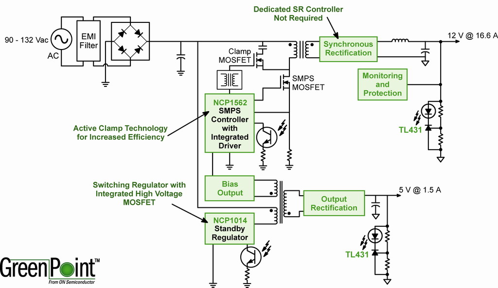 這個(gè)參考設(shè)計(jì)中的關(guān)鍵器件是NCP1562,為需要高能效和高功率密度電源而設(shè)計(jì)的有源鉗位脈寬調(diào)制(PWM, Pulse Width Modulation)電壓模式控制器。擁有極高精度(最多為±5%)的占空比限制,NCP1562讓設(shè)計(jì)工程師進(jìn)行MOSFET的優(yōu)化選擇,結(jié)合最佳能效和成本。這款器件的精度超越現(xiàn)有競(jìng)爭(zhēng)器件,它具有軟停止功能避免常見于正向有源鉗位拓?fù)浣Y(jié)構(gòu)振蕩,帶來更加安全且更強(qiáng)健的設(shè)計(jì)。為增強(qiáng)設(shè)計(jì)的安全性和可靠度,這器件具雙模式過電流保護(hù)電路,分別用來處理暫時(shí)和連續(xù)的過電流情況,這些集成的性能帶來了系統(tǒng)效能和安全性的最佳折衷,也縮減電源應(yīng)用的開發(fā)時(shí)間。