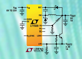 凌力爾特公司 (Linear Technology Corporation) 推出采用 3mm x 3mm DFN 封裝的 2A、25V 降壓型開關穩壓器和線性控制器 LT1939。該器件在 3V 至 25V 的 VIN 范圍內工作,適用于調節多種電源,如受保護的汽車電池、工業電源和未穩壓的交流適配器。其 2.3A 內部開關可以在電壓低至 0.8V 時提供高達 2A 的連續輸出電流。開關頻率是用戶可編程的,可同步至 250kHz 至 2.2MHz,使設計師能夠優化效率,同時避開關鍵噪聲敏感頻段。集成的 LDO 控制器結合一個 NPN 晶體管,確保主通道具有噪聲非常低的輸出,或者可以用作為第二個通道。LT1939 采用 3mm x 3mm DFN-12 封裝,高開關頻率允許使用小的外部電容器和電感器,可組成占板面積非常緊湊和高熱效率的解決方案。
