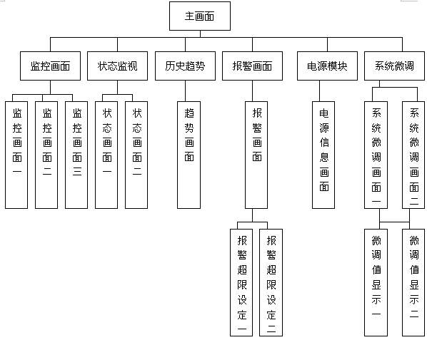 (1)系統功能設計:44個數字量采集顯示,故障判斷;6個電源模塊的數據采集顯示、顯示電源模塊的工作狀態并判斷報警;39路模擬量顯示、并判斷上下限報警;顯示報警畫面、報警信息、當前報警、報警頻次;報警上下限設定;數據微調功能,并且顯示微調值; 歷史趨勢圖顯示;不同畫面開啟權限設定; 以上有必要說明的是數據微調功能,由于現場的一次測量元件測量會有誤差,而且此誤差是固定的,短時間內是不變的,所以在程序當中增加這部分功能,使最終顯示出來的數值是消除誤差之后的值;