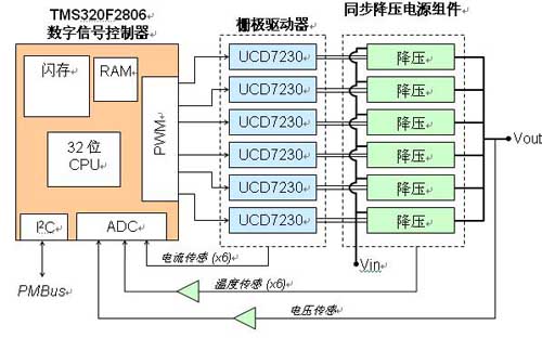 TI 推出的 32 位 TMS320F2806 數字信號控制器 (DSC) 運行在 100 MHz 頻率下,并且以電源應用為目標。在本例中,其在軟件中實施電壓模式控制,該軟件使用一個在 PWM 開關頻率上進行采樣的單通道 2 極點 2 零點數字補償器。隨后產生的占空比值將被傳給每一個降壓相(所有為實現相位平衡所作的占空比調節除外)。通過使用片上 12 位模數轉換器 (ADC) 獲得系統輸出電壓反饋。MOSFET 溫度在整個 ADC 中均為可用,以實現監控的目的,并且片上內部集成電路 (I2C) 端口提供了對 PMBus™ 通信的支持。針對同步降壓應用專門設計了一款 UCD7230 柵極驅動器,從而提供了采用 TI TrueDrive™ 輸出架構的雙通道 4-A MOSFET 驅動器、周期性電流限制以及一個內置低失調、高增益、差分電流傳感放大器。