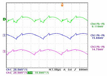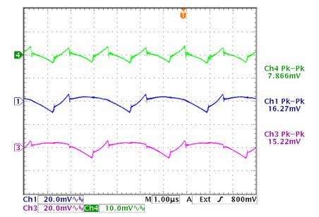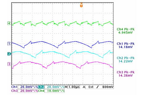 圖 2a 顯示了一款 120° 交錯式(條件:10V 輸入、2V 輸出、3A 負載及300 kHz PWM 開關)PWM 結構的三相交錯式降壓轉換器的示波器屏幕采集圖。示波器通道 1 至 3 顯示的是單個相位電壓,而通道 4 顯示的是交錯式輸出電壓(所有示波器通道均為 AC 耦合)。通過所有運行中的三個相位,可以得出該輸出紋波為 4.9 mV(輸出電壓的 0.25%)。在沒有調整兩個剩余相位(見圖 2b)角的情況下,切除相位 2 會引起輸出紋波增加 86%,即為9.1 mV。為了獲得 180° 交錯(見圖 2c),對兩個剩余相位進行軟件調整以后,該紋波減少至 7.9 mV。在仍然比初始值大的同時(因為一個兩相位系統無法獲得如一個三相系統一樣的低紋波),其比未被調整的剩余相位角提高了 13%。