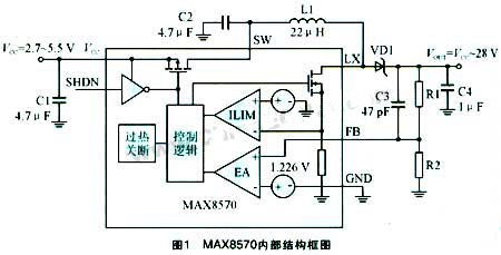 圖1所示是MAX8570的內部結構框圖。當MAX8570上電時,其芯片內部的P溝道MOSFET導通,電源電壓VCC經電感L1分成兩路:一路送至內部N溝道MOSFET的漏極,另一路經VD1向C4充電。當N溝道MOSFET導通時,流經L1中的電流從零逐漸增大,同時將電能儲存在L1中,一旦電流達到極限值,N溝道MOSFET將關斷,L1中的電流經VD1對負載供電。該方式中的開關頻率將隨負載和電源電壓的大小而變化,最高可達800kHz。
