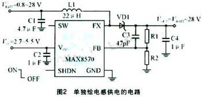 電感是升壓變換器的關鍵元件,其取值大小直接影響著整個電路的正常工作。如果需要追求高效能,最好選擇電感量較小的電感,但MAX8570工作在較低的頻率下時,電感會產生磁飽和現象,從而引起紋波電流增大或損壞電感,故在選擇電感時,需要根據輸出電流、MAX8570的工作頻率電感的直流電阻、電感的額定電流和紋波電壓等條件來綜合決定,這里推薦電感值的范圍為10-100μH。