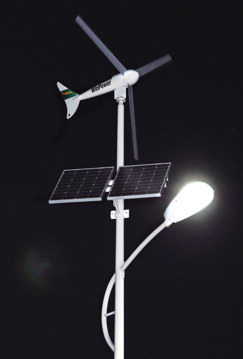 這種路燈叫做“風光互補”型路燈,燈桿頂端迎風旋轉的“螺旋槳”是大風葉,“太陽帽”則是太陽能板,能利用風能和太陽能雙系統供電:白天風機和太陽能電板將風能和光能轉化成電能,儲存到埋在地下的蓄電池里,夜間自動給路燈供電,在蓄電池電量充足的情況下,即使沒有能源的補給,這種路燈也能保證連續工作5個晚上。