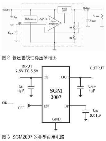 目前大多IC設計產商生產的低壓差線性穩壓器(LDO)典型封裝都是SOT23-5和SOT23-3,如圣邦微電子的SGM2007,SGM2013。圖3為SGM2007的典型應用電路圖。